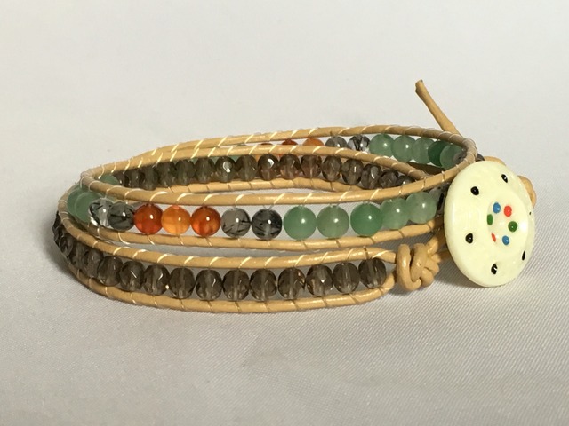 1本のブレスを手首に巻きつける「ラップブレス」です。 しっくりと馴染み、邪魔にならないのに存在感があります。 アクセサリーとしても、お守りとしても。あなたにお供いたします。 ※こちらは金属アレルギーフリー(ガラスボタン使用)になっています。 【素材】 サードニクス、ブラックルチルクオーツ、アベンチュリン チェコガラスビーズ 天然皮革 チェコガラスボタン 【長さ】 cm